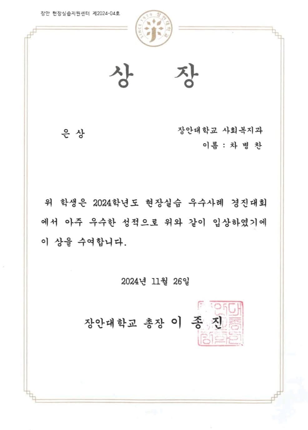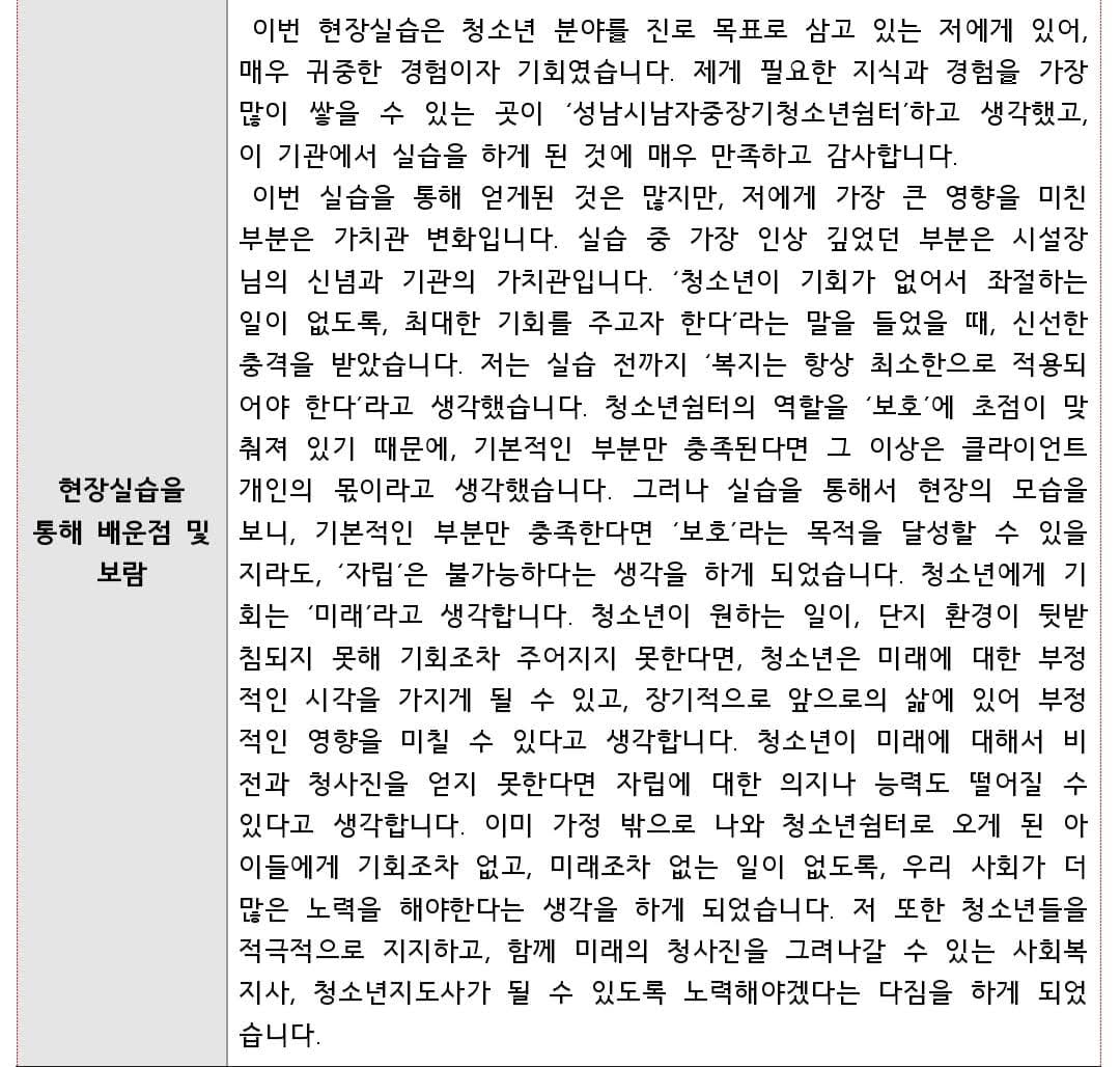 8월에 중장기쉼터에서 실습을 마친 차병찬 선생님이 양손가득 간식과 함께 쉼터에 방문하였습니다. 그동안의 안부를 묻고 이야기 하던 중, 실습이 끝나고 학교에서 진행하는 현장실습 우수사례 경진대회에서 '은상'을 수상했다고 하네요