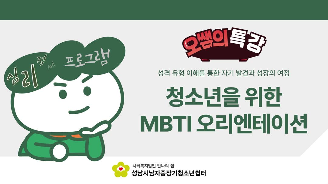 12월 17일 심리정서프로그램으로 MBTI 오리엔테이션 및 검사를 실시하였습니다. MBTI가 정확히 무엇인지 배우고 "너 T야?"라는 식의 비방하기 위함이 아닌 자기스스로를 이해하고 타인을 배려하여 조화로운 사회생활을 하기 위함임을 알게 된 시간이었습니다.