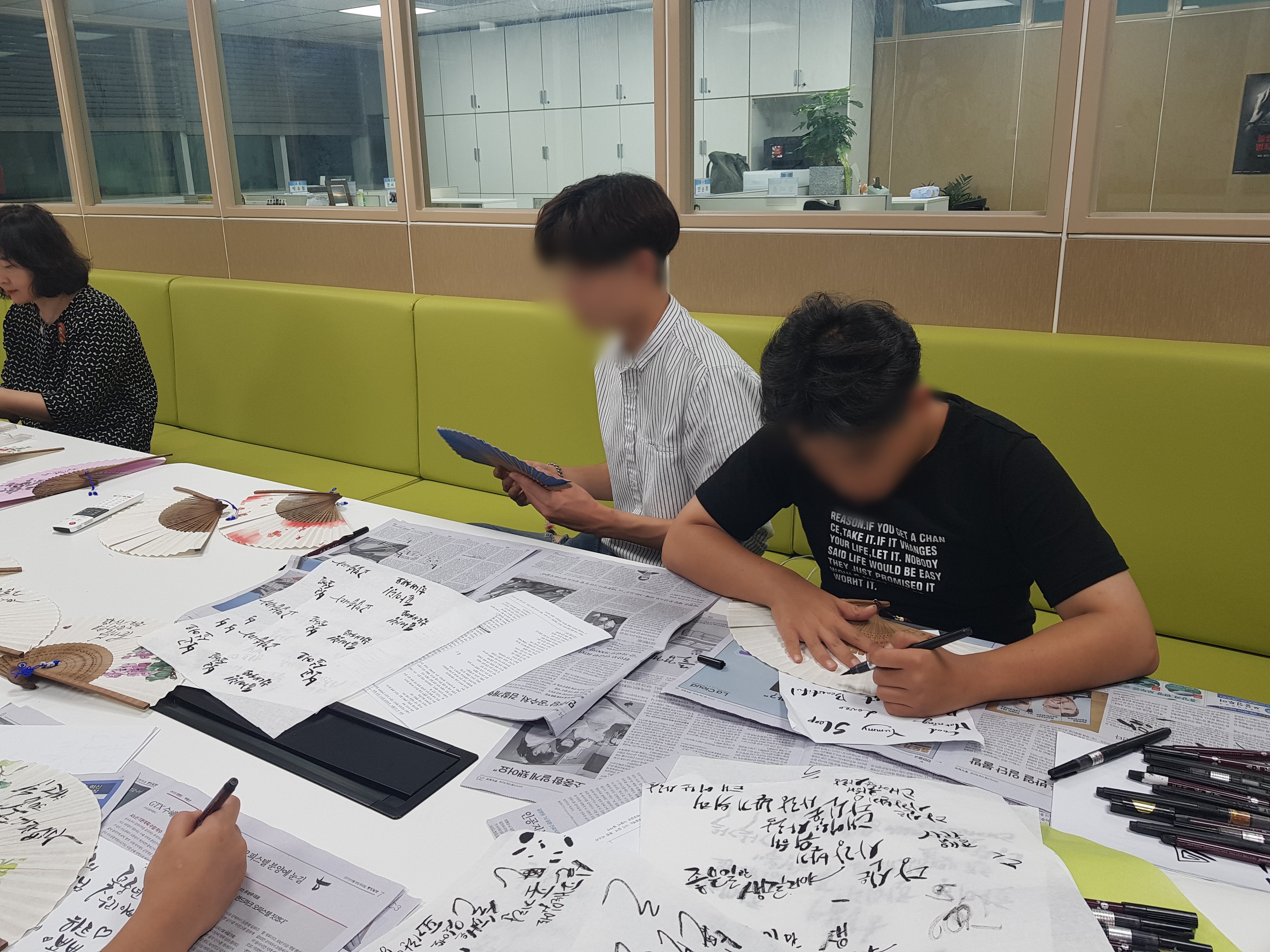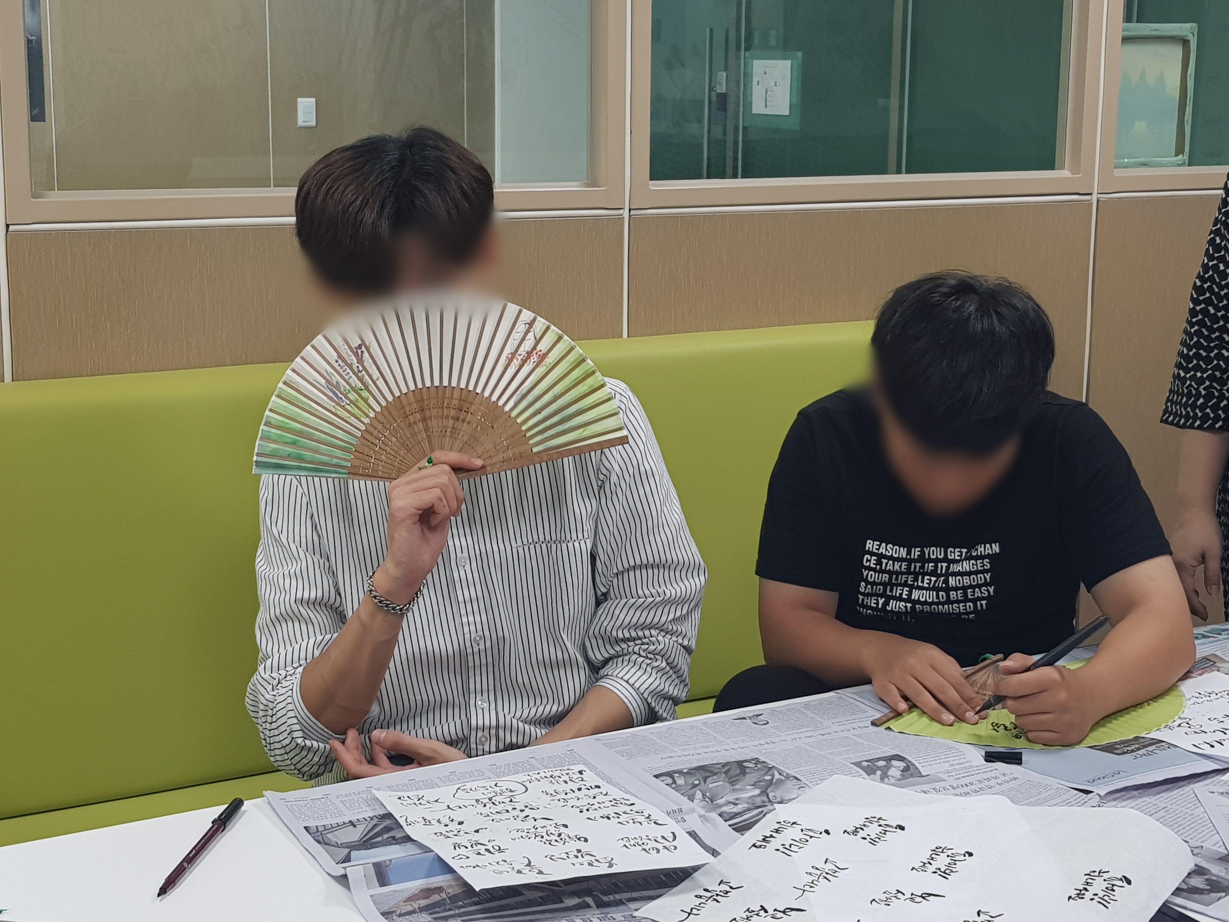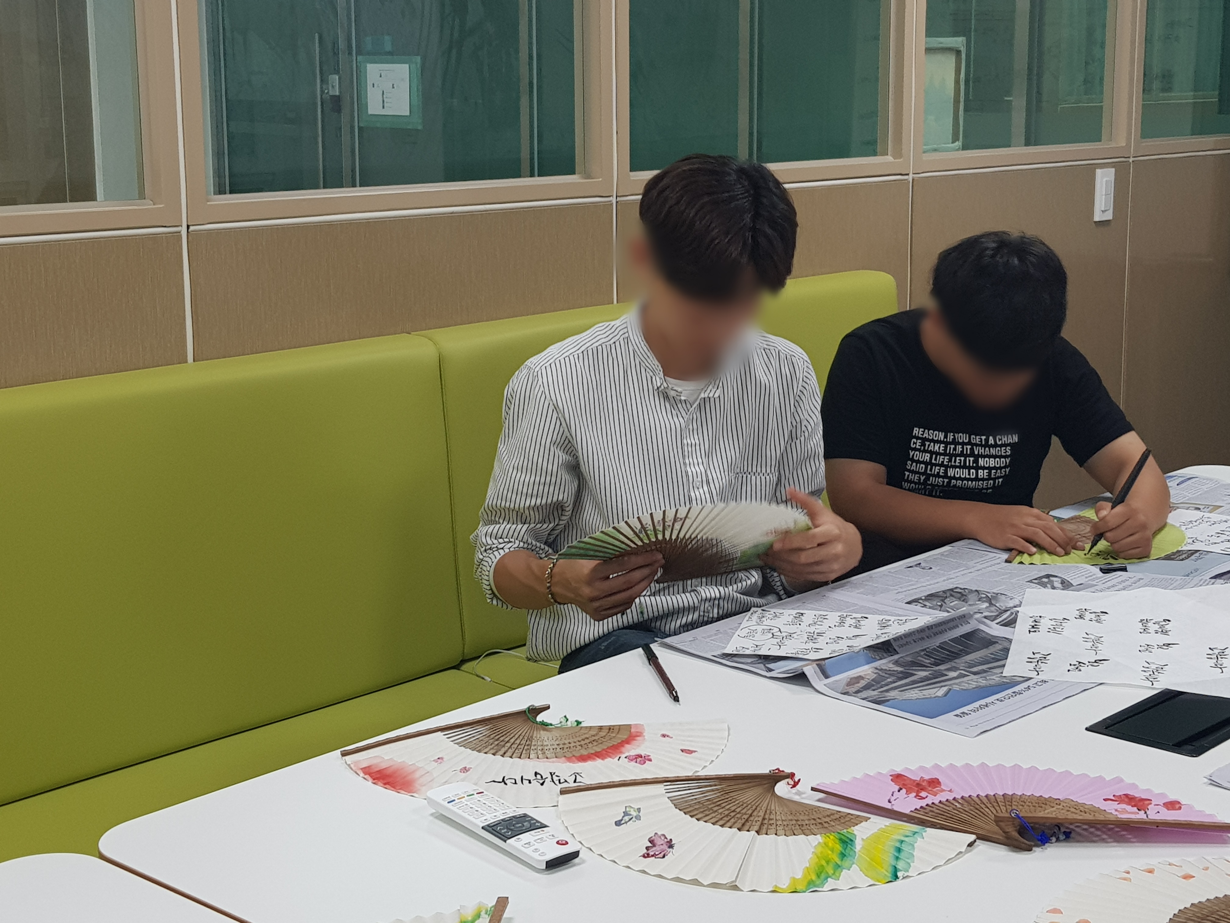 아이들이 정성스레 부채에 켈라그라피를 하였습니다.