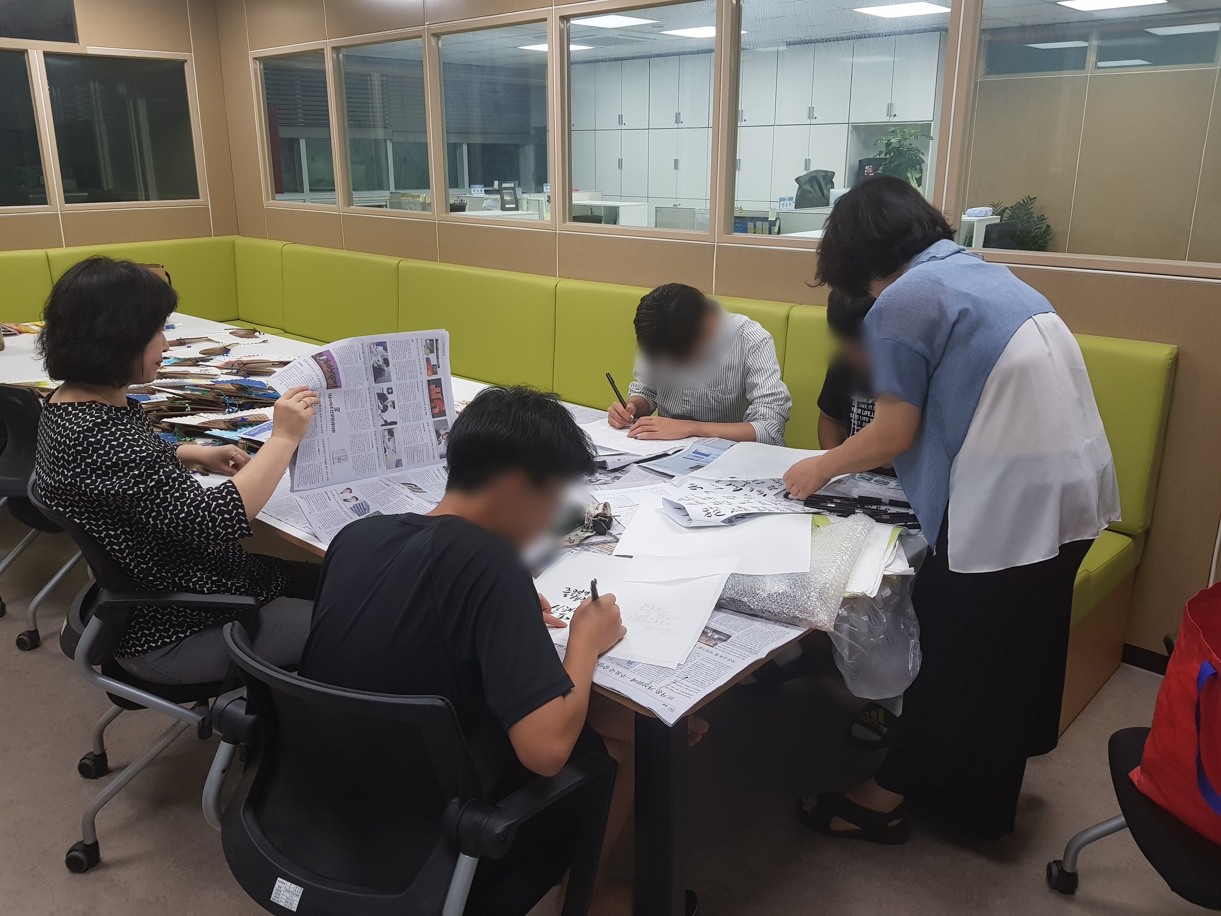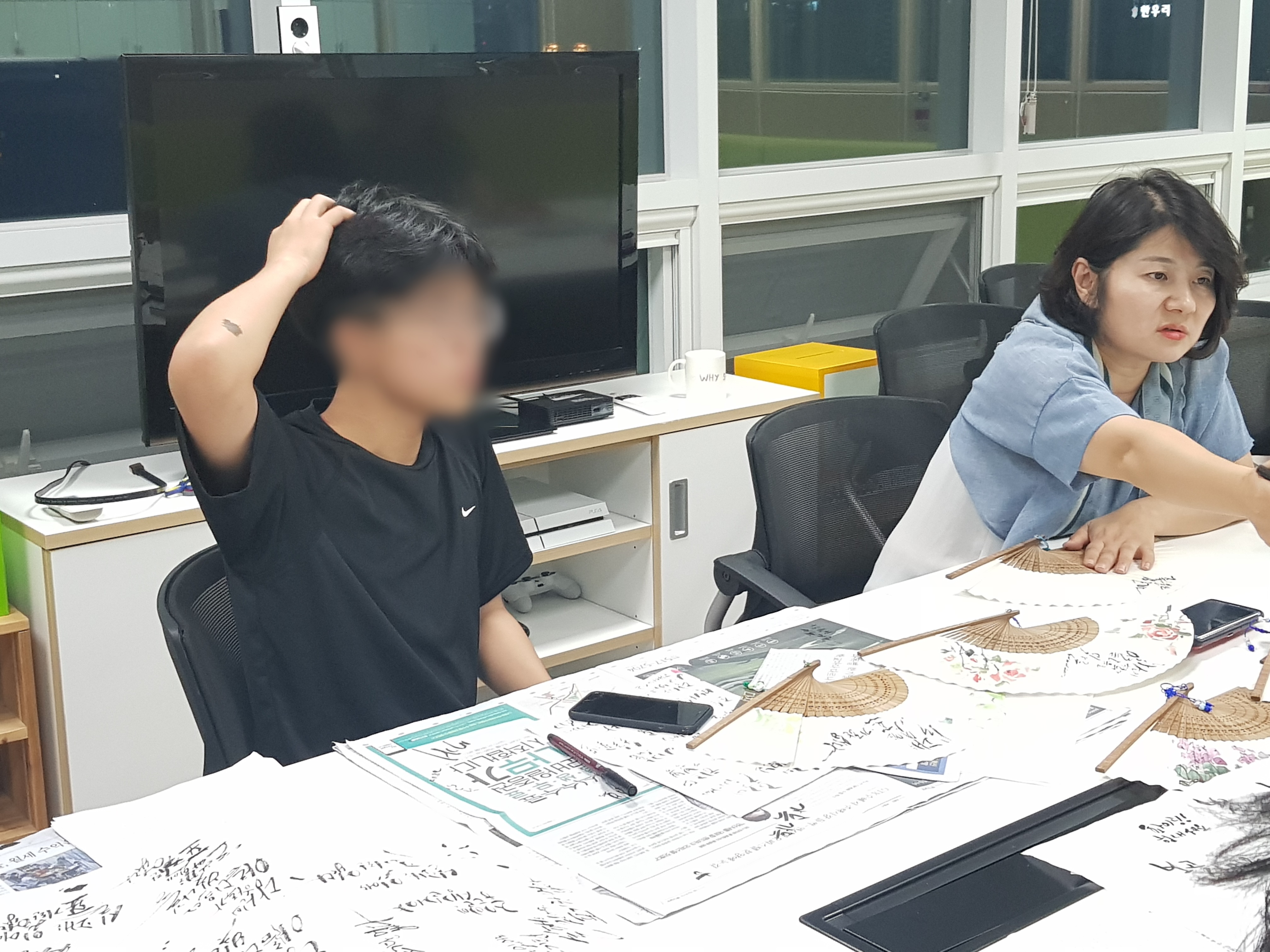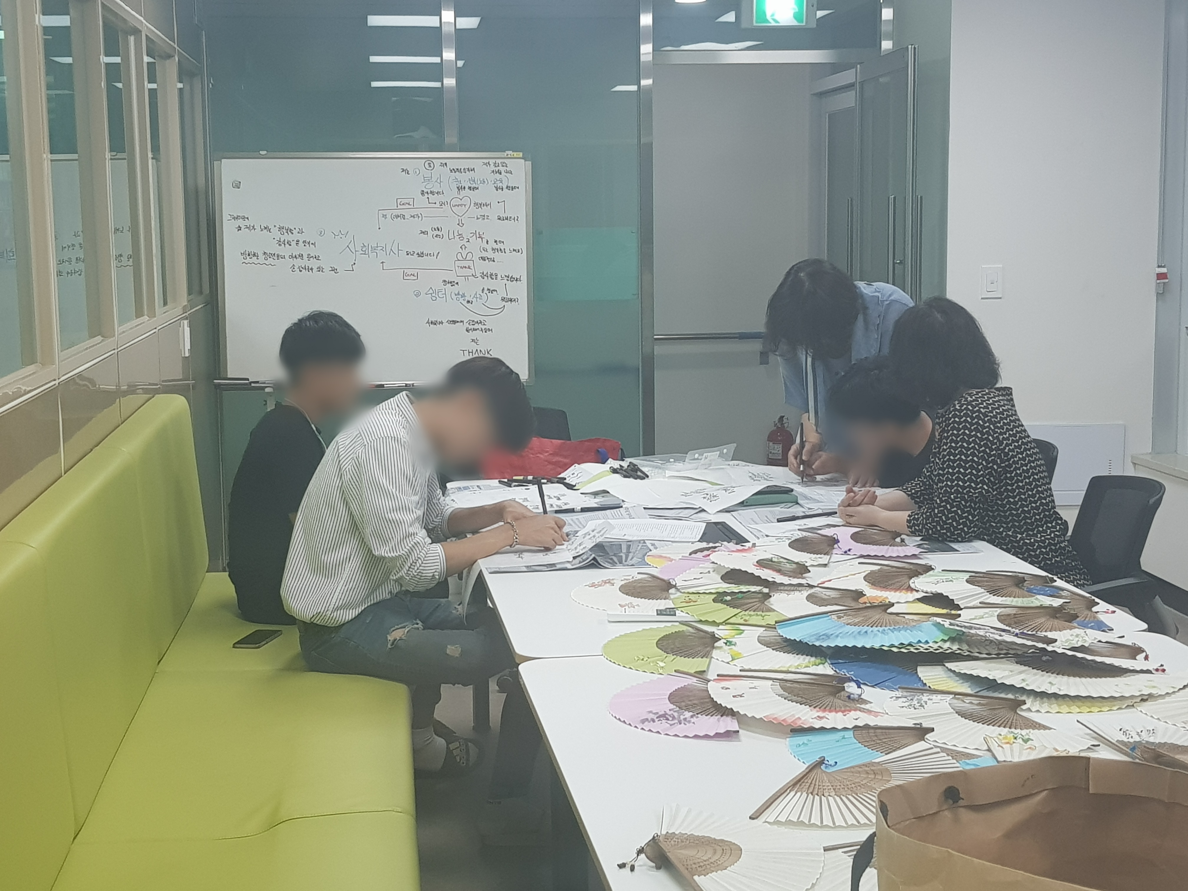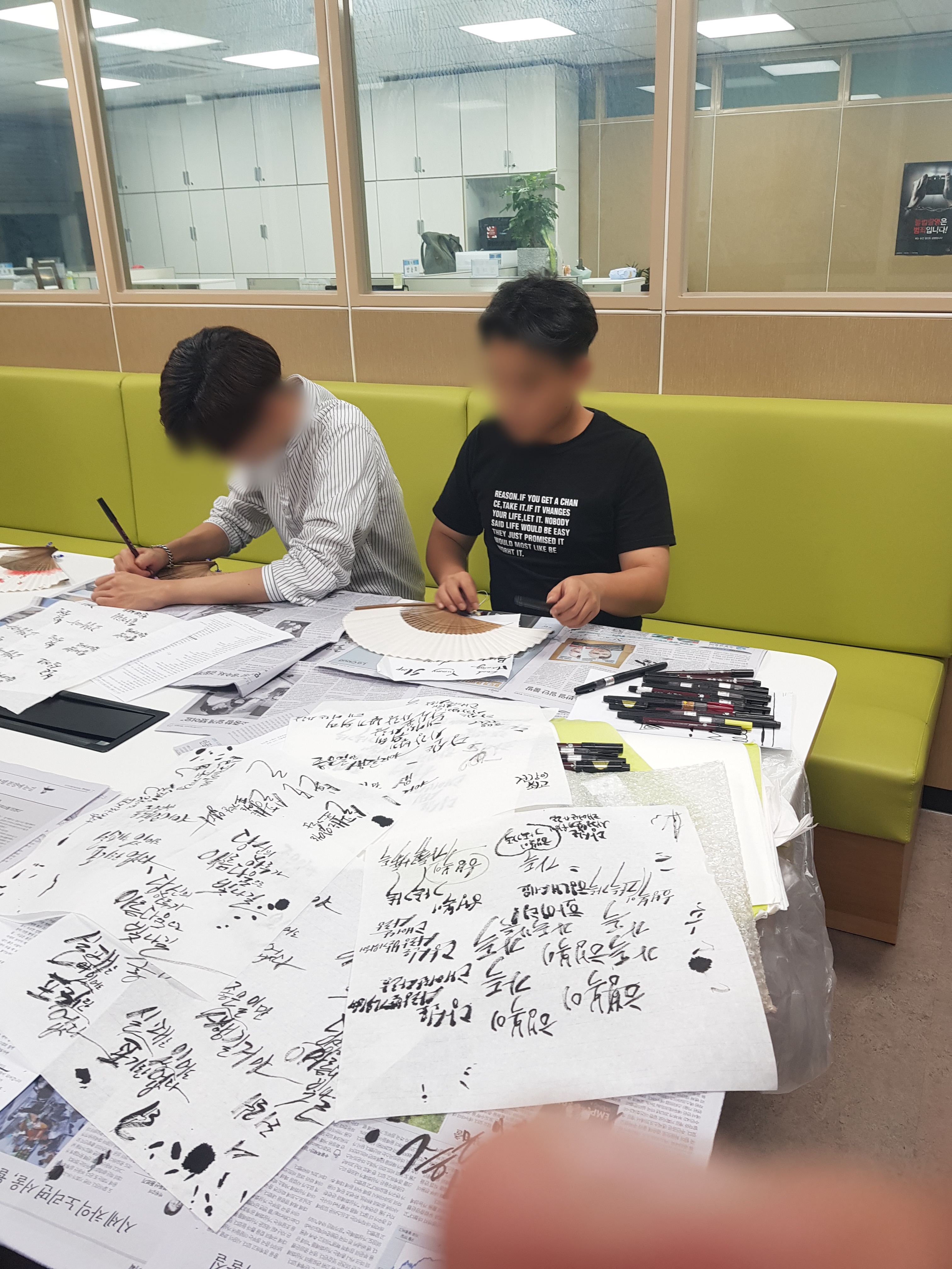 아이들이 정성스레 부채에 켈라그라피를 하였습니다.